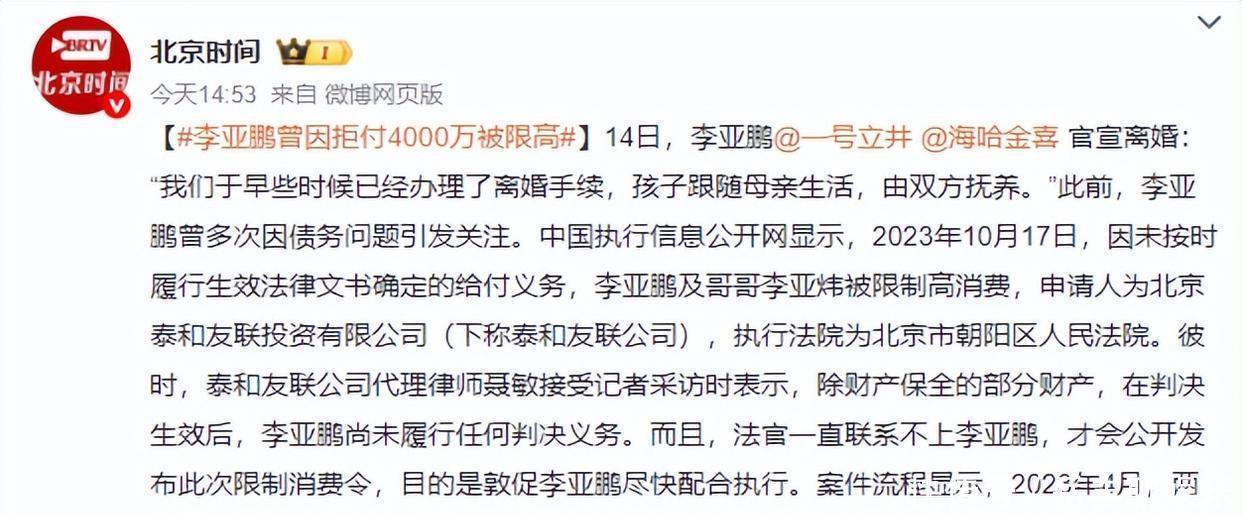 54岁李亚鹏官宣离婚!著名主持人曝离婚原因,不是因为巨额债务?